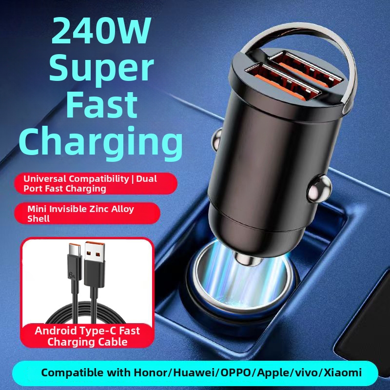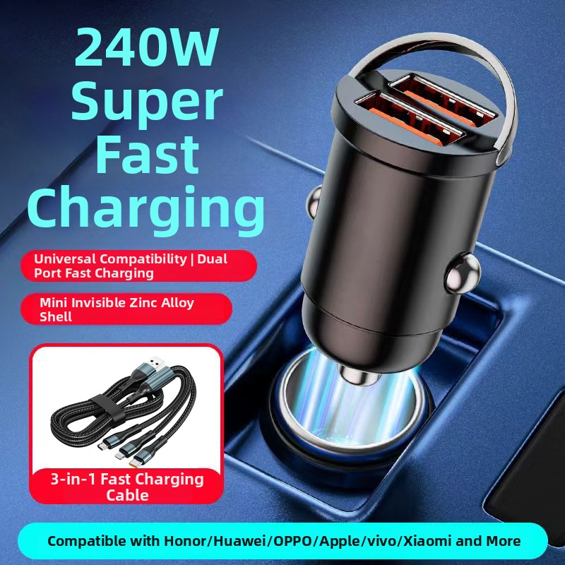 240W Car Charger Super Fast Charging Invisible 12V 24V Cigarette Lighter Dual USB Adapter Plug