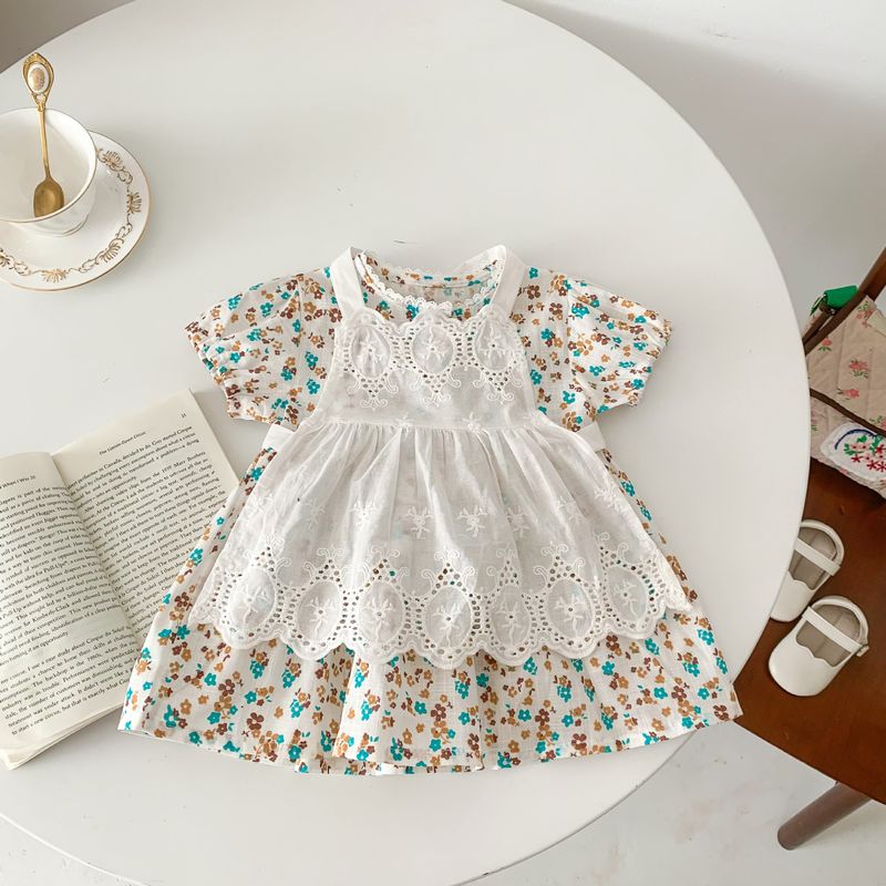 Djevojačka haljina 2024 Ljeto 2024. za dojenčad i malu djecu, crvena fragmentirana cvjetna suknja s kratkim rukavima, set od čipke za djevojčice