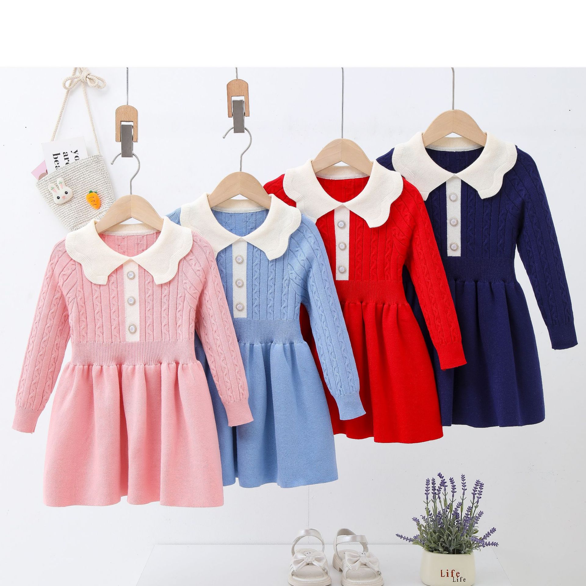 Children's knitting dress 2023 new lace doll collar Fried Dough Twists slim and versatile solid baby girl dress