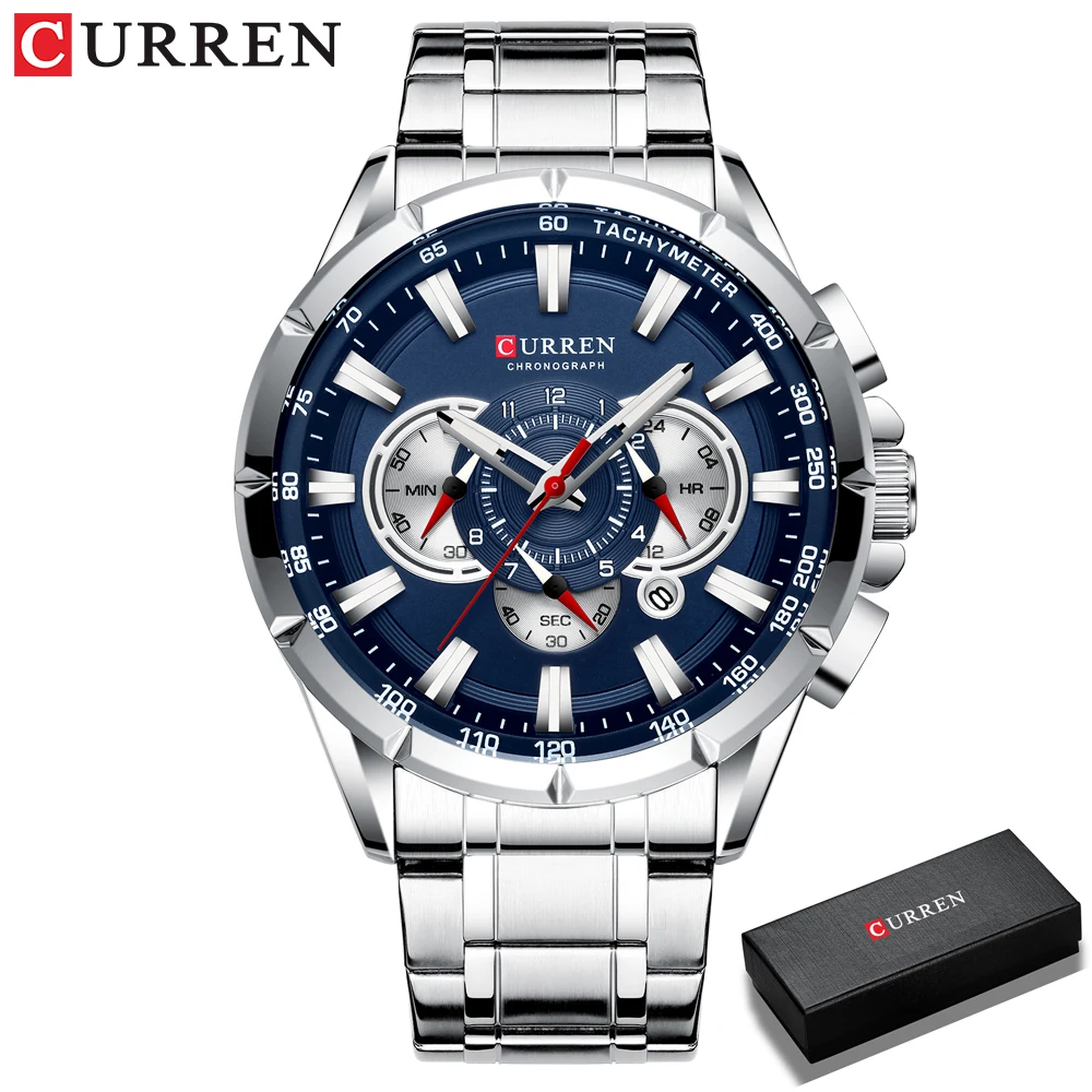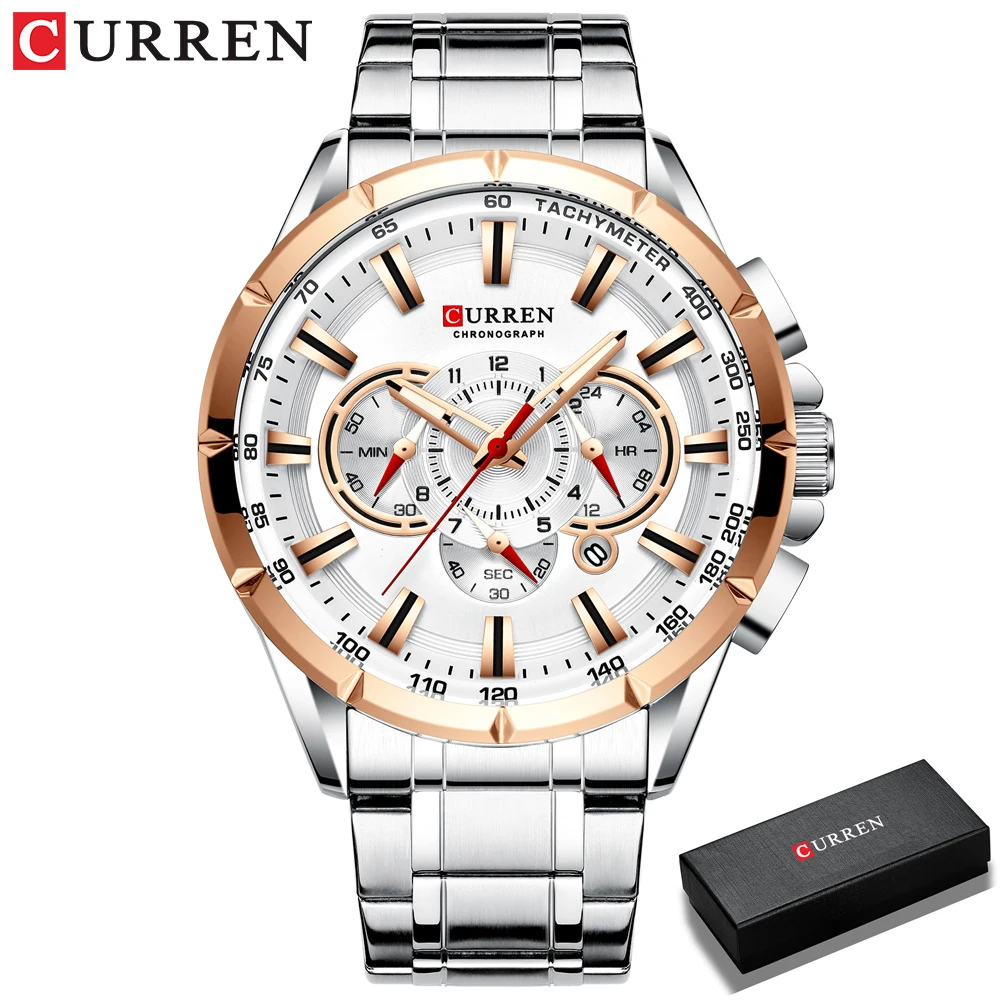Men New CURREN Casual Sport Chronograph Men's Watch Stainless Steel Band Wristwatch Big Dial Quartz Clock With Luminous Pointers