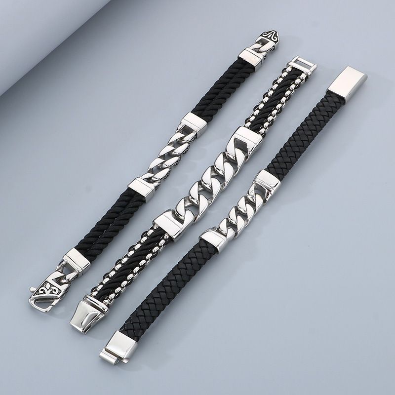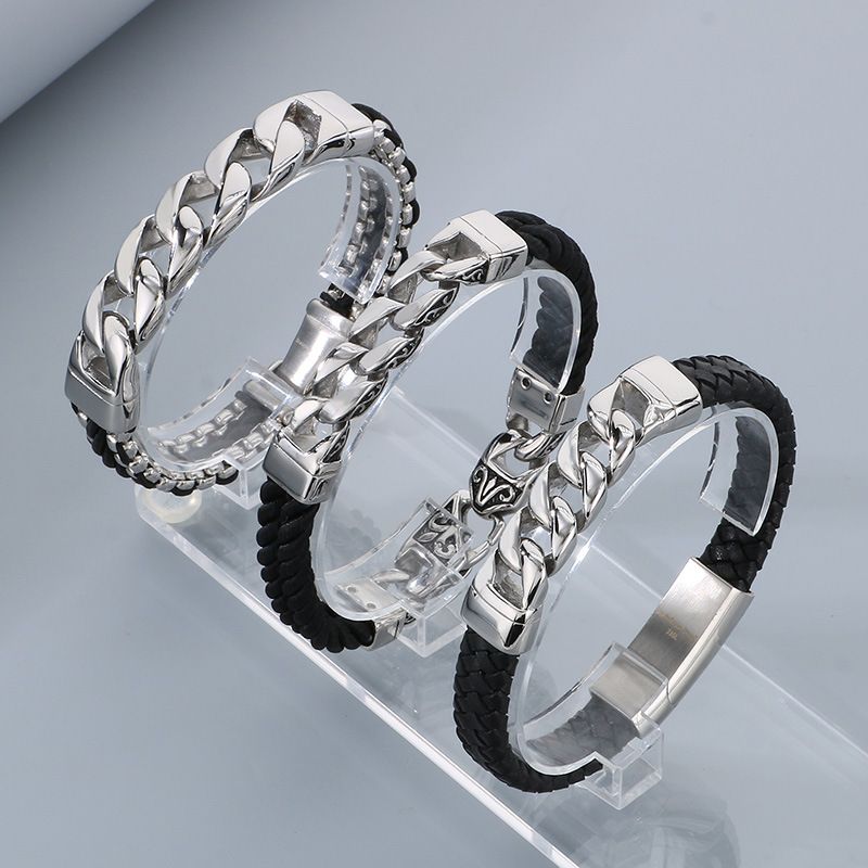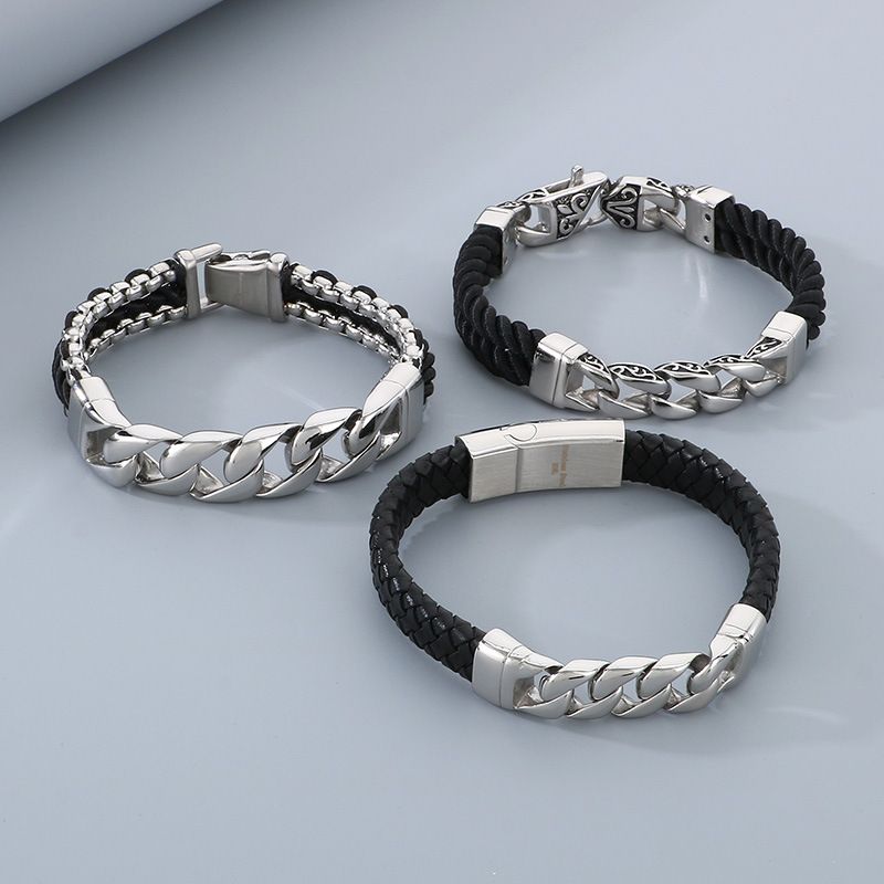 Stand out with this edgy and stylish men's bracelet, combining rugged leather with sleek titanium steel for a bold punk-inspired look.