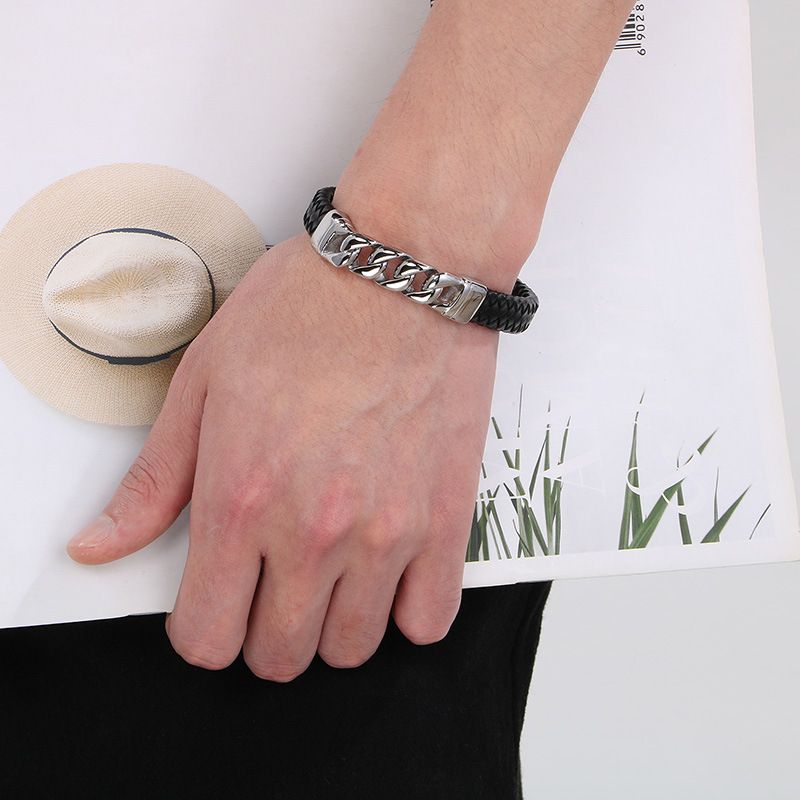 Men's Magnetic Closure Leather Bracelet With Titanium Steel Cuban Chain Design - Punk Style Geometric Cuff For Casual Wear