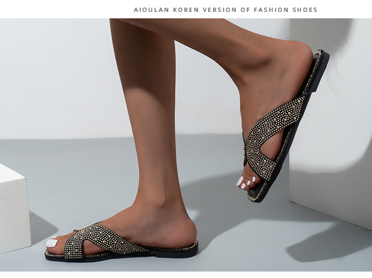 Fashion Ironing Diamond Flat Bottom Slippers Female Slides Square Head Hollow Sandals