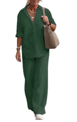 Women's Two-Piece Set Turn-Down Collar Long Sleeve Shirt Spring Autumn Casual Solid Color Pants Wide-Leg Suit